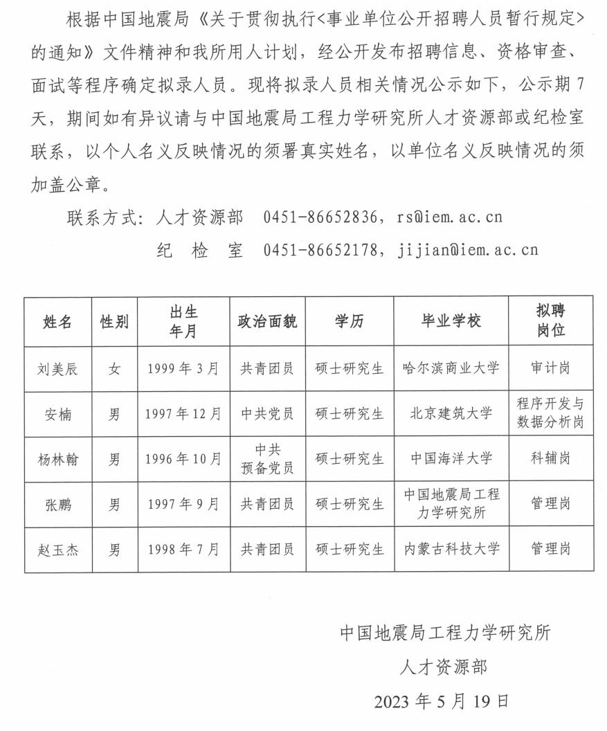 中國地震局工程力學研究所2023年擬錄用人員公示(二)